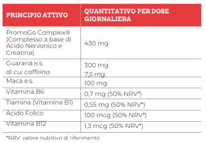 INGREDIENTI: Acqua; PromoGo Complex®, (complesso a base di Creatina monoidrata e acido Nervonico); Guaranà (Paullinia cupana K.) semi e.s. tit. 2,5% in caffeina; Maca andina (Lepidium Meyenii Walp.) radice e.s. E:D 1:4; addensante: Gomma di xantano; conservanti: Sorbato di potassio; Benzoato di sodio; acidificante: Acido citrico; aroma; edulcorante: Sucralosio; Vitamina B12 (Cianocobalamina); Vitamina B6 (Cloridrato di piridossina); Vitamina B1 (Cloridrato di tiamina); Acido folico (Acido pteroil- monoglutammico). MODO D’USO: Si consiglia l’assunzione di 1 stick pack al giorno, da assumere tal quale. GUSTO: Arancia.