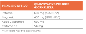INGREDIENTI: Magnesio citrato bibasico, citrato tribasico di Potassio, Potassio gluconato, acido L-Aspartico, Magnesio ossido, Cartamo (Carthamus tinctorius L., maltodestrine) fiori e.s, Barbabietola polvere, aroma, edulcoranti: Eritritolo, Sucralosio; agente antiagglomerante: Biossido di silicio. MODO D’USO: Si consiglia l’assunzione di 1 stick pack 2 volte al giorno, da sciogliere in un bicchiere d’acqua (100 ml). GUSTO: Arancia.